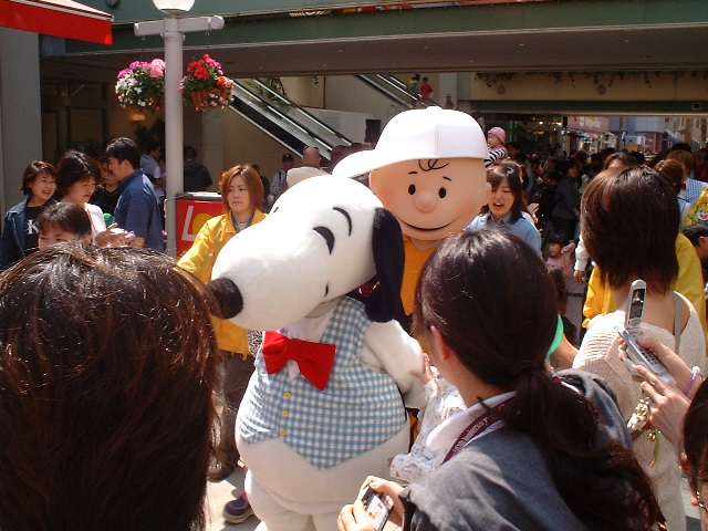 お疲れ様ぁ〜♪ ステージを降りるスヌーピーとチャック。 |